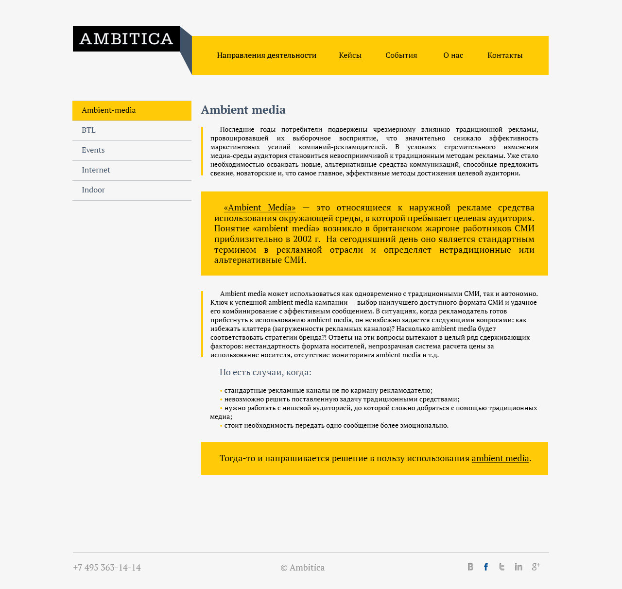 Разработка сайта рекламного агентства Ambitica, специализирующегося на нестандартных маркетинговых решениях.